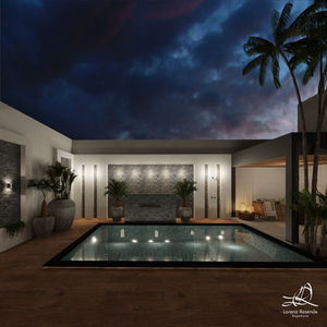 Área externa com volumetria reta e destaque para as pedras Miracema. Esse ambiente é complementado com coqueiros e plantas de pequeno porte, piso amadeirado fazendo referencia a um deck e parte dos acabamentos em granito São Gabriel.